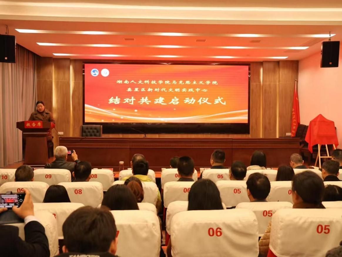 12月23日,beat365正版唯一官网必一马克思主义学院与娄星区新时代文明实践中心结对共建启动仪式在娄星区融媒体中心举行。beat365正版唯一官网必一党委副书记朱强、马克思主义学院党总支书记张卫明、院长于意及相关教师,以及娄星区委常委、宣传部长曾海军及新时代文明实践工作负责人出席,马克思主义学院部分学生参加。