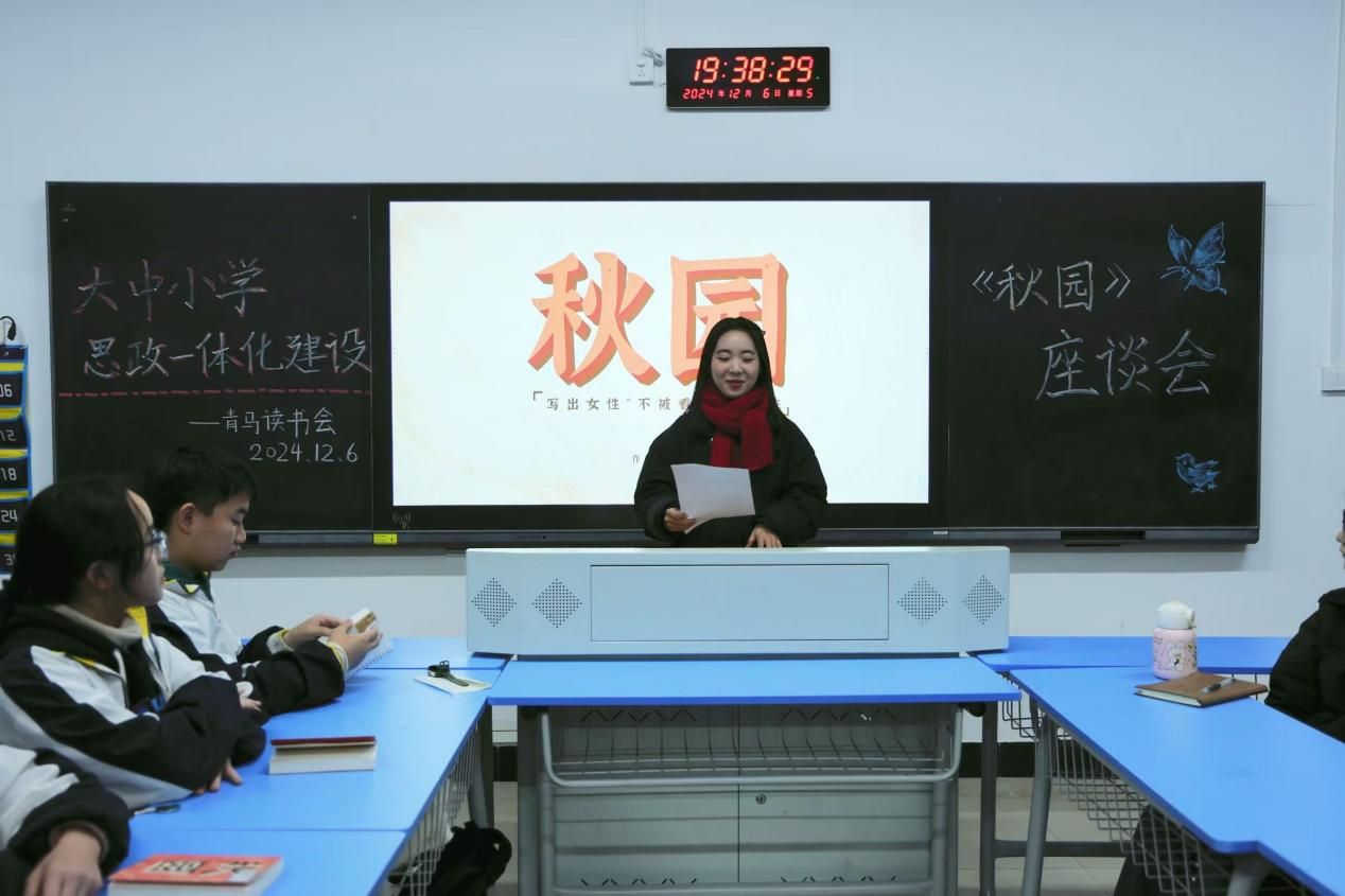 在张满同学对《秋园》进行了简要介绍后,同学们结合书中经典情节,从人物性格、家庭背景等多方面展开讨论,深刻感悟到个体在时代浪潮中的艰辛与坚韧,引发了对历史、社会与人生的深度思考,激发了同学们的前进力量。谢科峰在进行总结时强调,大中小思政课一体化建设需要多元的载体与丰富的素材,《秋园》作为一部反映时代变迁、人物命运起伏的优秀作品,是连接不同学段思政教育的桥梁。他鼓励同学们在书籍中汲取精神养分,将书中人物面对困难时不屈不挠的精神内化为自身的品质,以更积极的姿态应对成长道路上的挑战与挫折。