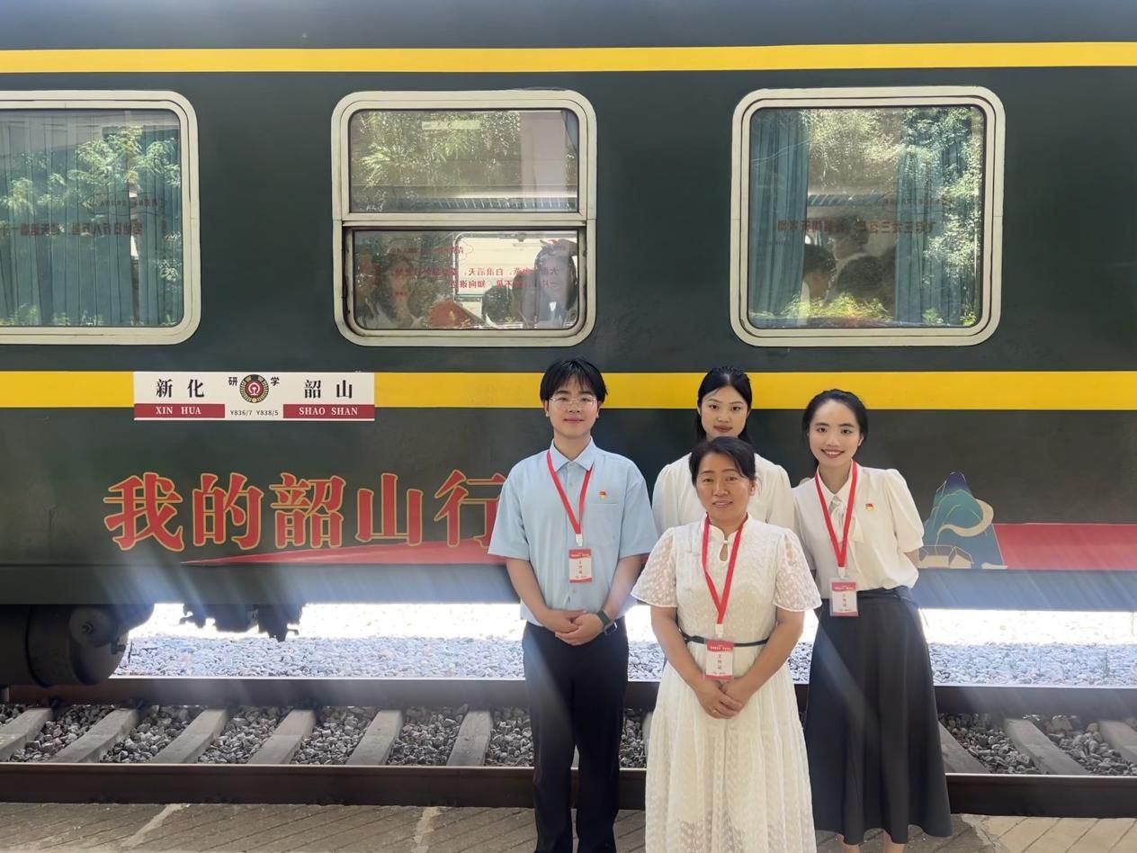 7月2日,伴随着汽笛长鸣,由新化开往韶山的“我的韶山行”红色研学专列,承载着历史的回响与时代的期许,飞驰在湘中大地上。来自beat365正版唯一官网必一马克思主义学院的学生黄如、李佩芬、谭思雨,在钟燕老师的带领下,以一堂题为《出发》的沉浸式思政课,在列车上将青年毛泽东徒步游学娄底的故事娓娓道来,让车厢化为连接历史与现实的时空走廊。