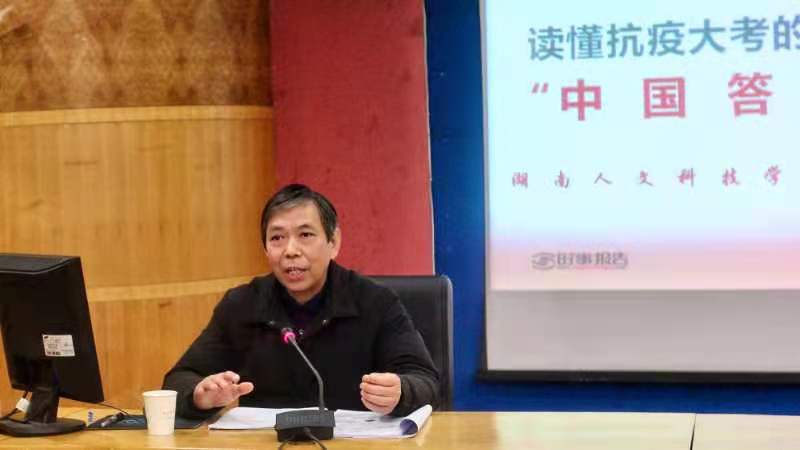 郭军通过对疫情期间中国应对疫情的一系列举措的介绍分析,阐述了在新冠肺炎疫情这场大考面前中国交出了满意答卷,给世界各国提供了“中国方案”贡献了“中国智慧”,这既体现了中国作为一个社会主义大国的责任担当,也深刻体现了中国特色社会主义制度显著的制度优势。最后,郭军寄语同学们要坚定道路自信、理论自信、制度自信、文化自信,不负时代重托,不负人民期望,坚定理想信念,练就过硬本领,投身伟大事业,成就伟大梦想。