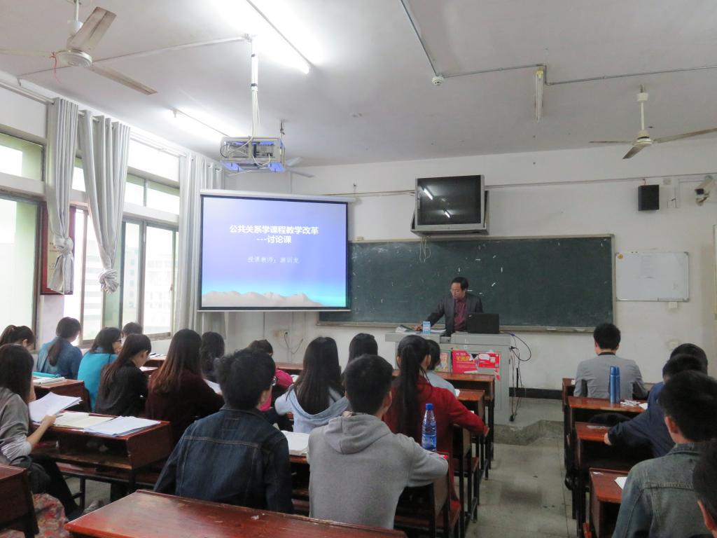4月25日上午,思想政治教育教研室在致远楼306教室开展院级公开课活动。游训龙教授主讲了《公共关系课程教学改革之一:讨论课》,他首先介绍了公共关系学的学科性质、公共关系的三段式教学改革,并以“我心目中的公共关系”为内容展开讨论。4位学生做了主题发言,以讨论方式展开教学。游老师对学生的主题发言做了全面而精准的点评,使学生对公共关系学有了更全面和深刻的理解。此次思想政治教育教研室开展的院级公开课活动,得到了校院领导的高度重视,胡云生等三位学校督导、院领导范大平、陈灿芬以及院里部分老师参加了听课,课后院领导组织了评课。(思想政治教育教研室周玉珍)