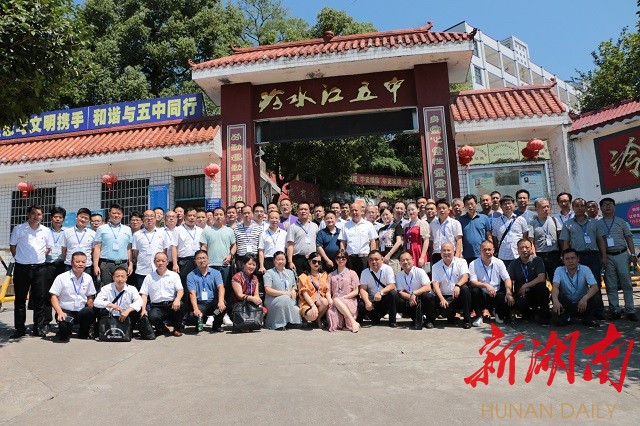 9月26日上午,beat365正版唯一官网必一“国培计划”初中骨干党组织书记提升工作坊研修班(E115)全体学员,在“国培计划”首席专家beat365正版唯一官网必一马克思主义学院副院长杨国辉、研修班班主任成赛军、教研室主任孙淇庭的带领下,赴“湖南省教育系统先进基层党组织”冷水江五中实地考察学习。