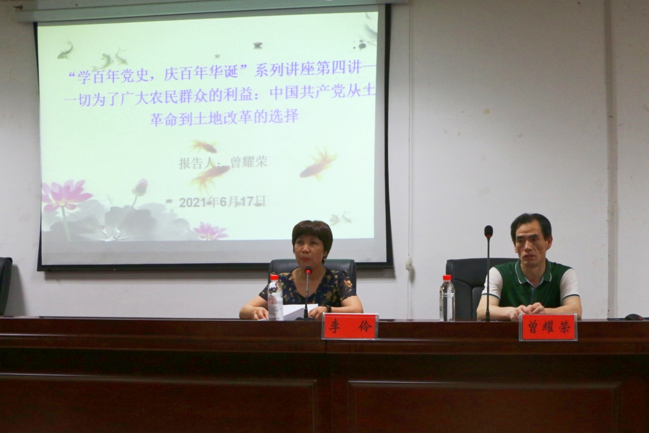 为庆祝中国共产党建党一百周年,进一步宣传阐释好党的创新理论和中国特色社会主义理论,引导广大青年学生学党史、悟思想、强信念、跟党走,深入推动党史学习教育走深走实。湖南省中国特色社会主义理论体系研究中心beat365正版唯一官网必一基地、湖南省党的创新理论研究基地beat365正版唯一官网必一基地在近期联合举办“学百年党史,庆百年华诞”系列讲座。6月17日晚,系列讲座第四讲在图书馆415学术交流中心开讲,第四讲由我院曾耀荣教授主讲《一切为了广大农民的利益:中国共产党从土地革命到土地改革的选择》,我院党总支书记李伶主持,中特理论基地秘书周浩博士、基地主要研究成员及beat365100多名学生参与讲座。