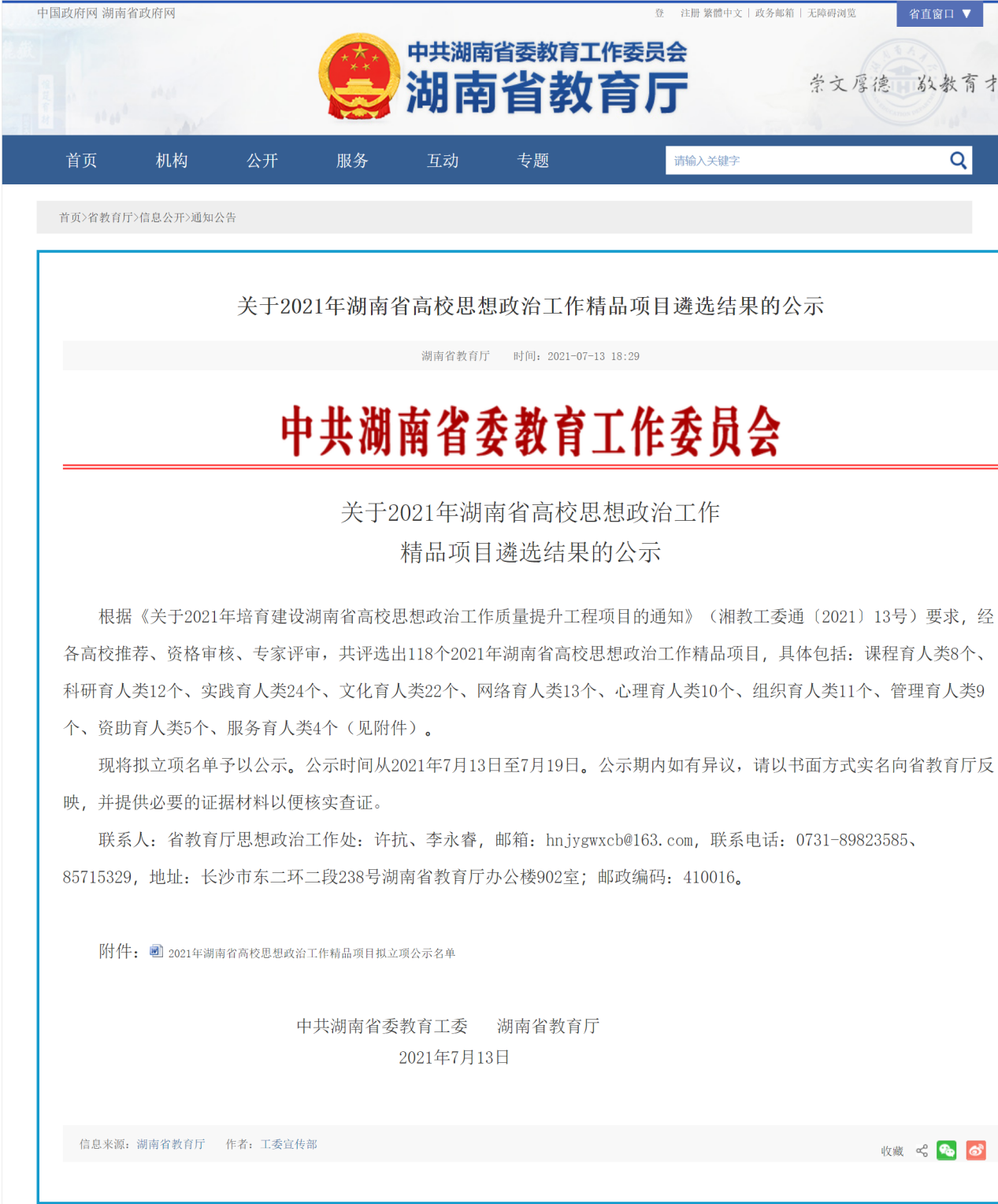 根据《关于2021年培育建设湖南省高校思想政治工作质量提升工程项目的通知》(湘教工委通〔2021〕13号)要求,经各高校推荐、资格审核、专家评审,共评选出118个2021年湖南省高校思想政治工作精品项目。