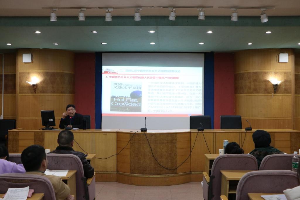 首先,李佑新解读了党的十九届四中全会及其主题,通过党历届全会的发展历程来引出党的第十九届四中全会召开的必要性。他指出,党的第十九届四中全会是一次具有开创性、里程碑意义的重要会议。党的第十九届四中全会召开于“两个一百年”的历史交汇点,会议的主题是坚持和完善中国特色社会主义制度,推进国家治理体系和治理能力现代化,事关根本。随后,李佑新分析了中国特色社会主义制度的显著优势。他讲到,最大的优势在于坚持中国共产党的领导,而党是以马克思主义理论为指导,与时俱进地把马克思主义中国化、时代化、大众化从而来指导中国实际,因而要坚定中国特色社会主义的制度自信,警惕历史虚无主义思潮、警惕自由主义西化思潮。他强调,中国特色社会主义制度优势中还有许多内涵值得我们去学习和琢磨。接着,李佑新就如何把握坚持和完善中国特色社会主义制度的任务和要求、如何将《决定》的目标任务全面落到实处进行了分析、提出了自己的见解,并要求当代大学生要积极承担社会责任,勇于做时代新人,为实现中华民族伟大复兴的中国梦而努力奋斗。最后,张卫明对此次讲座进行了总结。他指出,此次讲座为我们学习党的第十九届四中精神提供了思路,也为我们学习马克思主义理论成果提供了机会。
