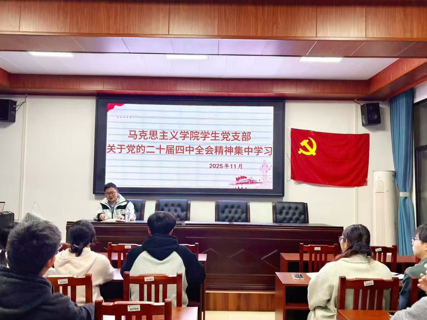 11月4日,马克思主义学院学生党支部在若谷楼116开展党的二十届四中全会精神集中学习活动。此次活动由学生党支部书记张得才主讲,学院全体学生党员参加。