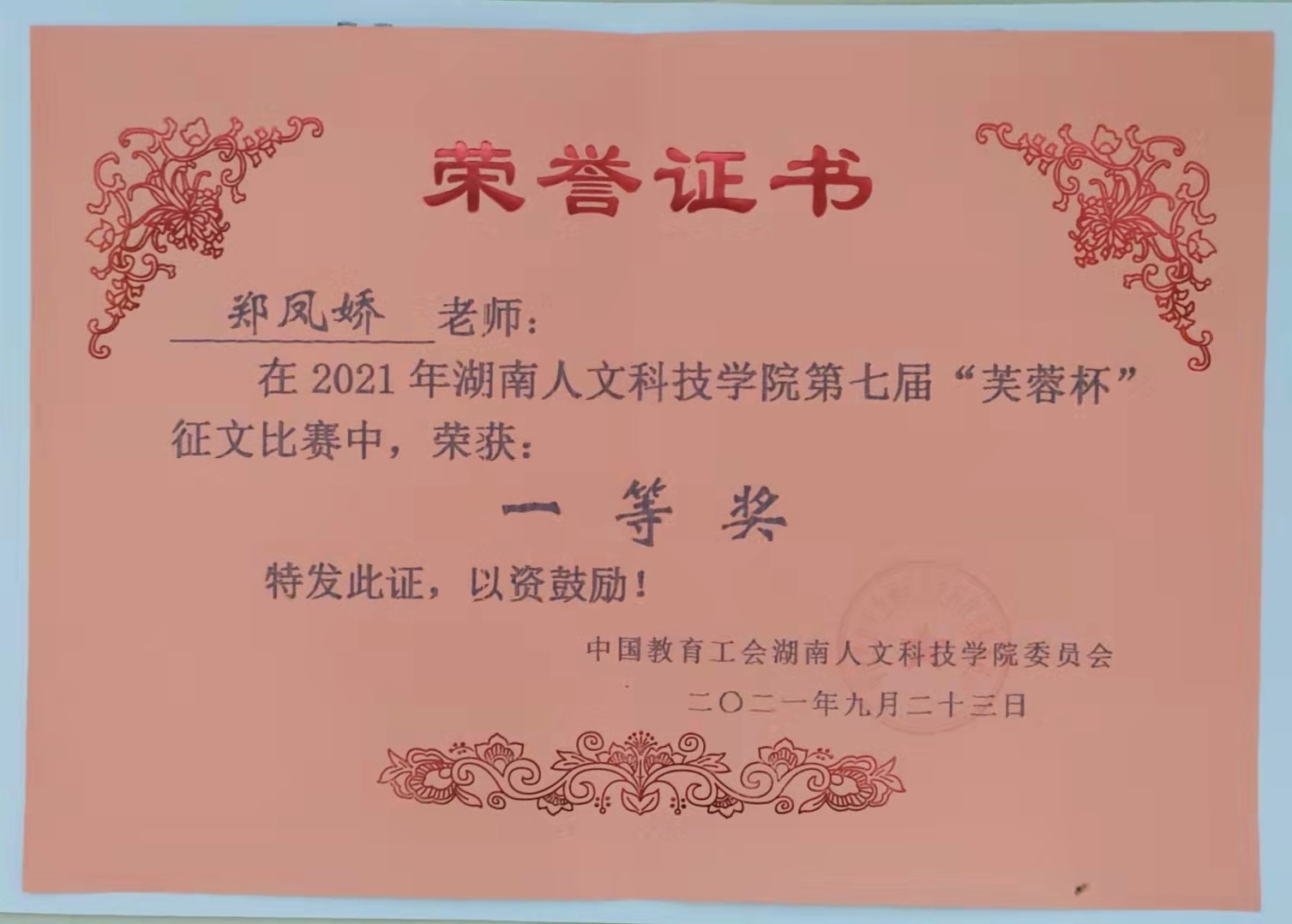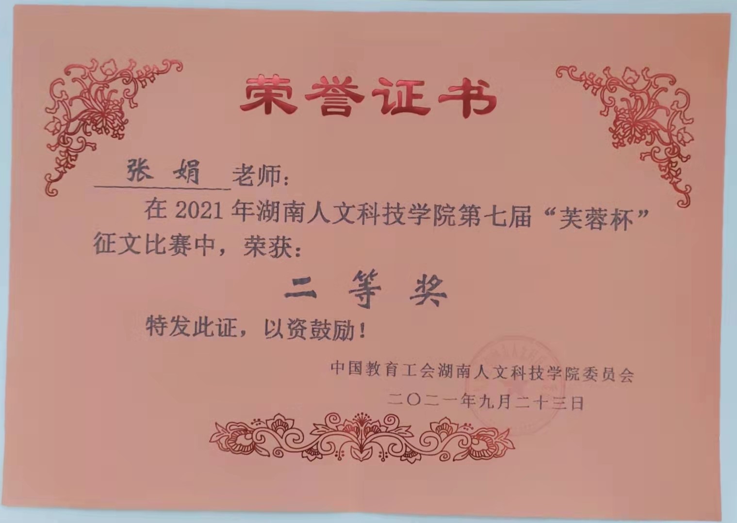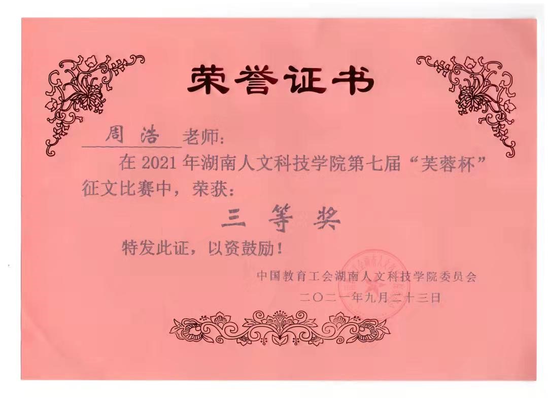 为了进一步落实《2021年湖南省“师德师风建设年”实施方案》《beat365正版唯一官网必一关于建立健全师德建设长效机制的实施办法》(校党发[2018]12号)文件精神,深化师德师风建设,提升教职员工的写作能力,由学校工会主办、外国语学院承办的2021年“红星照耀中国”征文比赛活动于10月3日圆满结束。本次活动共评选出一等奖2名,二等奖3名,三等奖7名。我院郑凤娇、张娟、周浩三位博士分别荣获一、二、三等奖。