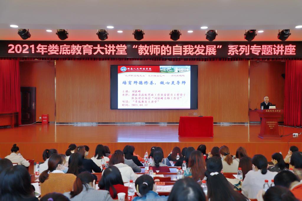 4月中下旬,学校党委委员、副校长,湖南省高校思想政治工作“刘铁峰名师工作室”主持人刘铁峰教授应娄底市教育局教师培训中心之邀,作客“娄底教育大讲堂”,为市直学校250余名教师做“教师的自我发展”系列讲座,为中小学教师的职业规划、能力提升、自我发展提供培训和指导。