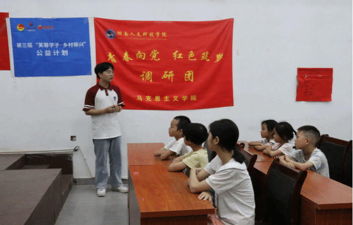 为关爱乡村留守儿童,激发青年大学生社会责任感,7月18日下午,我院“青春向党 红色筑梦”调研团在湖南省第三届“芙蓉学子·乡村振兴”公益计划支持下,以生动鲜活的大思政课形式,为村内留守儿童开设爱国主义教育专题公益课。帮助留守儿童扣好人生第一粒扣子,共同为乡村留守儿童的成长撑起一片蓝天。