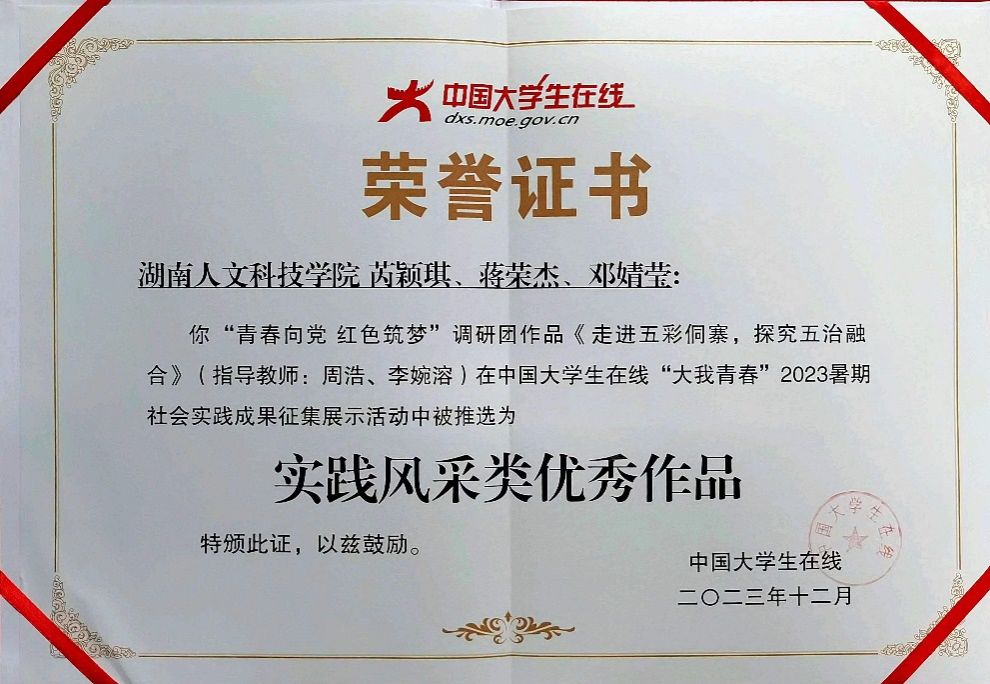 近日,由教育部中国大学生在线主办的“大我青春”2023暑期社会实践成果征集展示活动的推选结果公布。我院“青春向党 红色筑梦”调研团创作的《走进五彩侗寨,探究五治融合》被推选为全国实践风采类优秀作品。