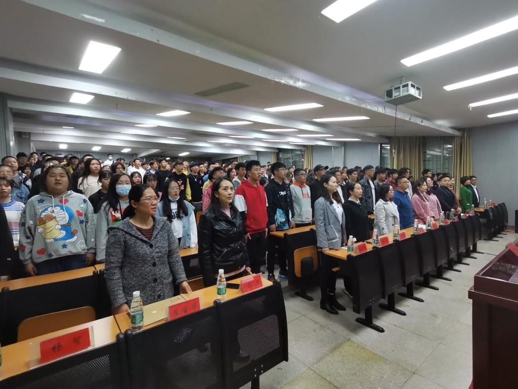 会议伊始,与会师生全体起立奏唱国歌,伴着激昂的旋律,大家歌声宏伟嘹亮,声声入耳。接着老生代表、新生代表先后上台发言,分别提出了如何珍惜大学四年时间的建议及决心。随后,学生辅导员周舞、杨泽文、左玉洁就学生奖助学金评定、学生资助、学生评先选优、寝室管理、应征入伍、学籍管理、违规违纪处理等校规校纪给全体新生作了详细解读;教务办主任刘溪就教学常规管理、课程设置、考风考纪等规定进行了介绍。