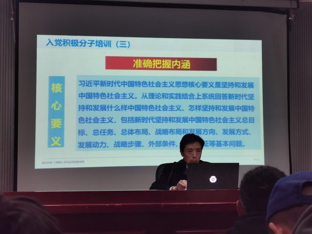 在培训期间,美术与设计学院和音乐舞蹈学院主要领导亲自给学员上课。谢光绎作党员《理想信念教育》专题讲座。他强调,“理想信念之所以重要,在于它是共产党人的灵魂和特质,是共产党人经受过任何考验的精神支柱。是否拥有马克思主义的信仰和社会主义、共产主义的信念,是区别一个人是否从思想上入党的最重要的标志,是判断一个共产党人思想上是否纯洁的首要标准”。音乐与舞蹈学院党总支书记刘纲华为入党积极分子作了《党的指导思想、性质、宗旨、路线和纲领》和《党的组织制度和党纪党风》的授课。美术与设计学院副院长陆序彦作了《习近平新时代中国特色社会主义思想》专题讲座。美术与设计学院党总支副书记易俊作了《党员的权利和义务》授课。