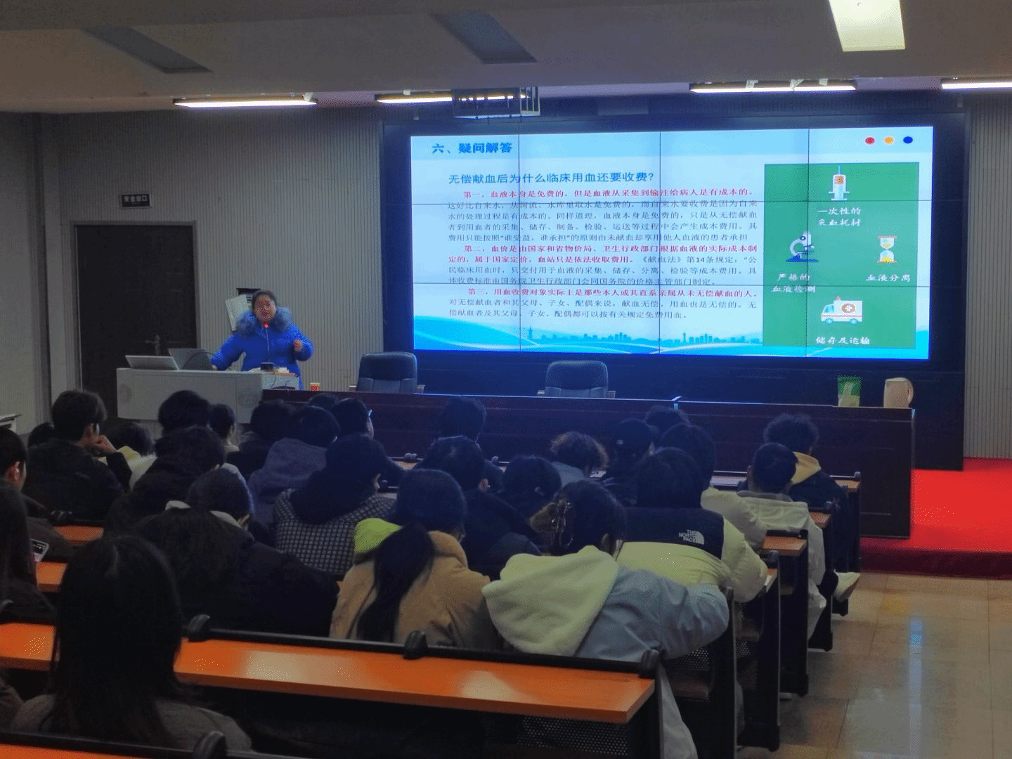 3月4日下午,美术与设计学院联合市中心血站在逸美楼报告厅开展了无偿献血知识讲座。市中心血站质管科廖旭、采血科曾梅、美设院党总支副书记黄庆源以及辅导员邹凌云出席了此次讲座。