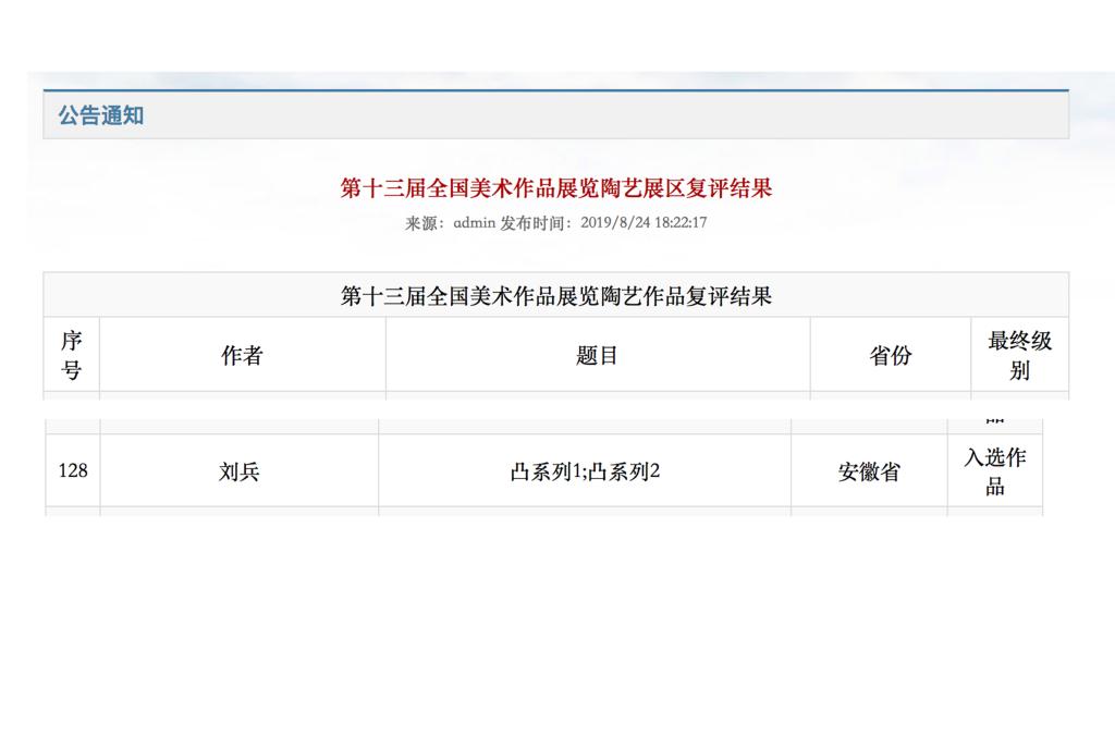 8月20日,“第十三届全国美术作品展览”陶艺展区复评工作在江西景德镇结束。经过严格评选,陶艺展区共遴选出274件入选作品。beat365美术与设计学院教师刘兵的陶艺作品《凸系列1》、《凸系列2》入选。