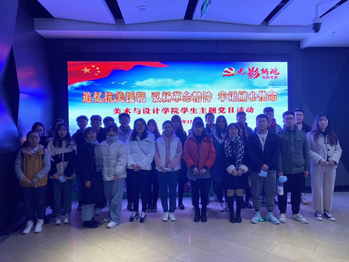 为纪念中国人民志愿军抗美援朝出国作战70周年,深刻领会抗美援朝的精神,更好地发扬和继承伟大抗美援朝精神,认真学习习近平总书记重要讲话精神。加强革命传统教育,增强全体党员责任意识和爱国情怀,美术与设计学院于12月9日晚开展“追忆抗美援朝 弘扬革命精神 牢记初心使命”主题党日活动,此次活动在娄底市幕语环球影院开展,参与活动的有美术与设计学院学生第二支部支部书记左玉洁老师以及美术与设计学院全体党员。