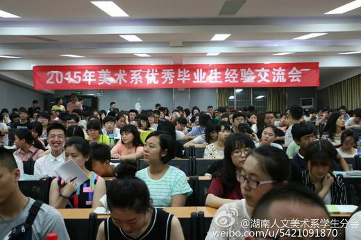 2015年5月28日晚7::30,我系在逸夫楼报告厅举行了2015届优秀毕业生经验交流会。出席本次会议的有美术系党总支书记李小林,分管学生会工作的李兰老师,11级辅导员张晶露老师,学生会、团总支主要干部,大一、大二、大三部分学生,大四毕业生代表共230多人参加了本次经验交流会。会议由李兰老师主持。