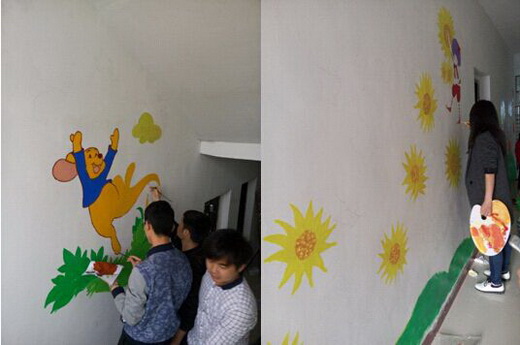 从4月13日到19日,设计学党支部的党员同志和设计学的入党积极分子利用课余和周末时间轮流去画手绘墙,手绘范围大,从5楼到9楼,面积多达300余平方米,但支部党员和入党积极分子不怕脏、不怕累,历时7天,服务团队精心完成了墙绘任务。向平男特殊培训中心的聋哑儿童们献上了一份特殊的爱心“礼品”。