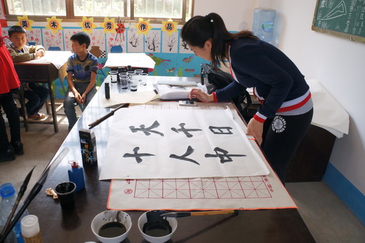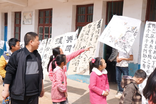 此次“文化下乡”活动展演的作品是由美术系学生党员精心进行创作而成,含国画、书法、水彩等多个种类,受到了芬水中学师生的喜爱。在展演中,中国书协会员、全国著名书法家易俊即兴创作了“文以载道”的作品一幅赠予芬水中学。学生党员代表佟真如、张林子、孙帅帅、于敬源分别到芬水中学的四个班级上了一堂书法美术课,开展艺术支教活动。佟真如为芬水中学四年级的同学们上了一节生动的书法课,主讲的内容是《书法的入门》,在课堂中同学们踊跃参加,课堂气氛十分活跃。党员代表张林子、孙帅帅、于敬源分别为其他年级上各上了一堂丰富多彩的美术课,受到同学们的喜爱。