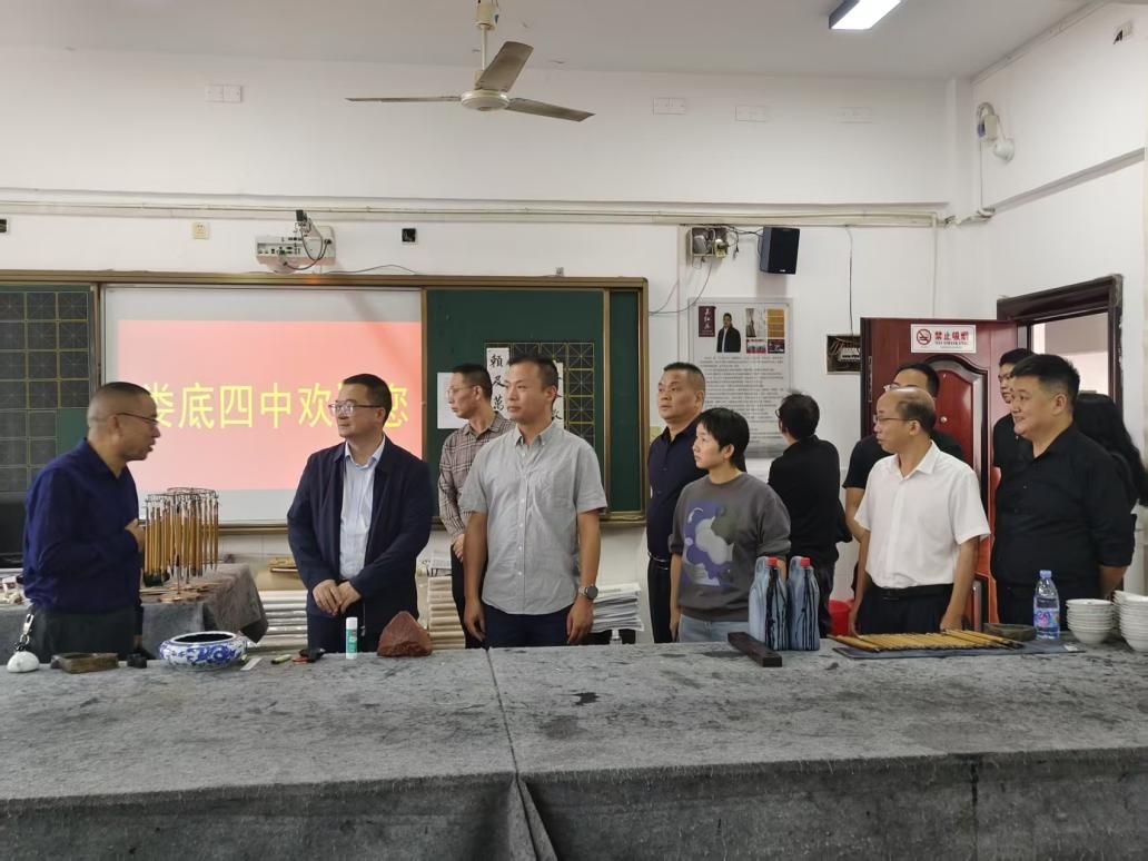 双方代表一行首先漫步校园,实地考察了学校整体办学环境。走进书法社团活动室,笔墨纸砚整齐陈列,墙上悬挂的学生书法作品或苍劲有力、或娟秀雅致,尽显书法教育丰硕成果,赢得考察团一致称赞。双方在参观中就书法特色教学、社团建设等话题深入交流,对娄底四中“以字育人”的教育理念高度认同。