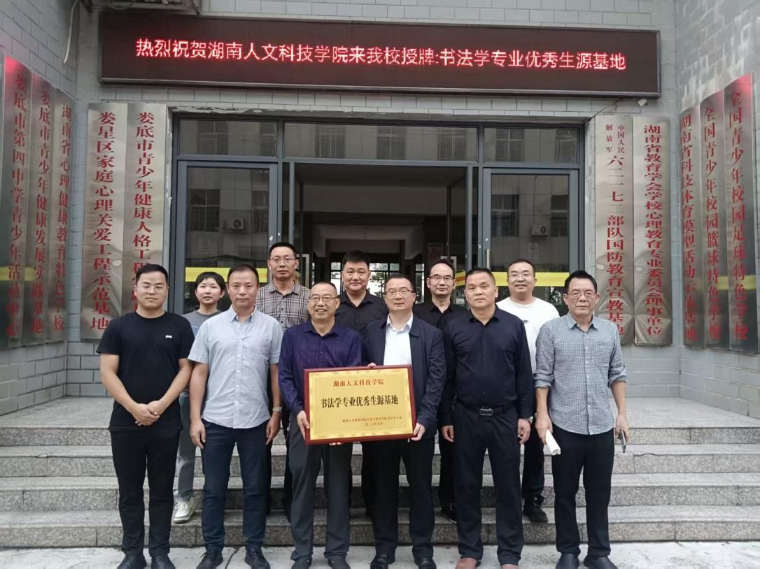 9月26日下午,beat365正版唯一官网必一美术与设计学院党支部书记阳立新、副书记黄庆源、书法学教研室主任李国清、书法教师段琦璐及两名学生代表邓亚辉、袁煜翔一行莅临娄底四中,举行“书法学专业优秀生源基地”授牌仪式。娄底市第四中学党委书记周宇文、校长谭尚军等校领导班子及教研室主任吴红兵等一同出席,对我们的到来表示热烈欢迎,双方共同见证两校教育协作新起点。