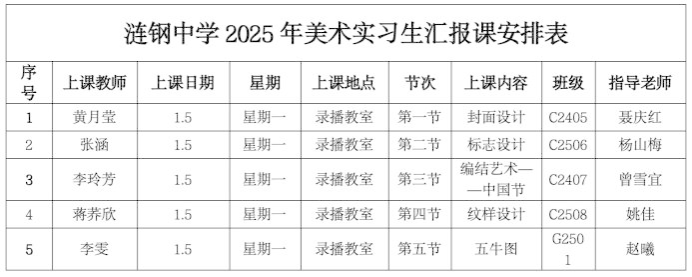 为进一步推动美术教育实践与创新,深化高校与中学美术教学交流,2026年1月5日,美术学专业涟钢中学实习队开展了实习汇报课活动。五堂各具特色的美术课依次呈现,充分体现了以核心素养为导向的美术新课程理念,并融入了“美术教育人文性、生活化与思辨培养”的教育思想。涟钢中学教学副校长谢红卫、工会主席蔡峻、教研科科长方强、艺术组副组长姚佳及美术组全体教师、我院美术学专业实习带队教师彭波参与听评课,并就课程设计与教学实践展开深度研讨。