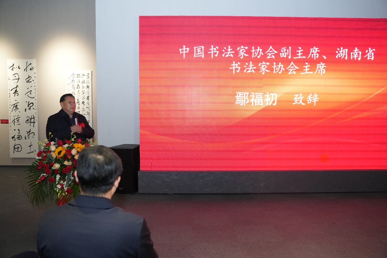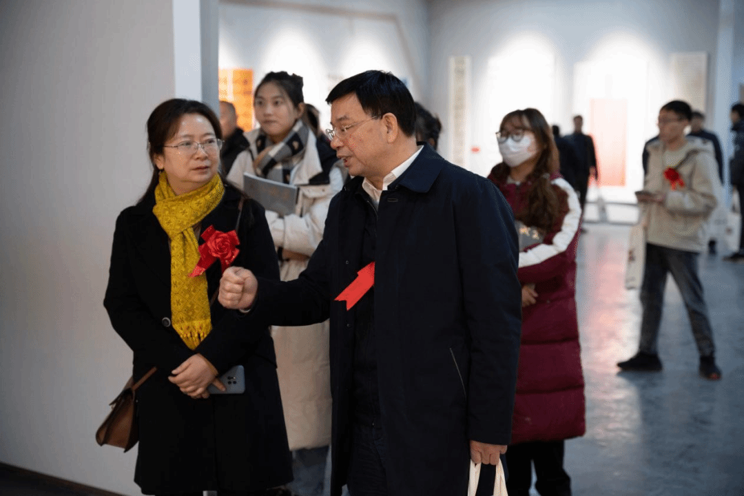 出席展览开幕式和参观展览的领导与嘉宾有湖南省委副秘书长袁美南,中国书法家协会副主席、湖南省书法家协会主席鄢福初,湖南省政协港澳台侨和外事委员会副主任李戈敏,湖南省国动办党组成员、副主任侯建斌,湖南省公共资源交易中心党组成员、副主任刘定文,湖南财信金融控股集团纪委书记陆群,湖南出版投资控股集团党委委员、中南出版传媒集团副总经理梁威,湖南省教育厅高等教育处副处长王荣,湖南省教育厅原党组成员、湖南省教育科学研究院原院长姜正国,中南林业科技大学党委委员、纪委书记杨鑫铨,湖南第一师范学院副校长周发明,娄底市教育局党组副书记、副局长、二级调研员易俊,湖南省书法家协会副主席、中南大学教授王希俊,中国书法家协会理事、湖南省文联委员、湖南省书法家协会副主席刘晓斌,中国书法家协会理事、湖南省书法家协会副主席崔向君,湖南省书法家协会副主席、中南大学教授、博士生导师罗红胜,湖南省文艺评论家协会副主席、中南大学教授、博士生导师向彬,湖南国画馆馆长、长沙师范学院美术学院原院长、教授罗湘科,以及湖南高校与书协同仁江波、李正庚、谢超、梁理、钟全昌、袁品良、文佐、李莹波、何亮、陈文波等。学校党委书记刘铁铭,党委委员、副校长陈志国,党委委员、纪委书记凌艳平,副校长刘建勋,校友总会会长、原党委书记刘和云,美术与设计学院领导谢光绎、成伟、童玲和贺平,书法学专业教师、学生,校内外书法爱好者等,以及来自中国美术报、中国艺术报、书法报、新湖南、湖南教育等相关媒体和自媒体记者共计约三百余人。