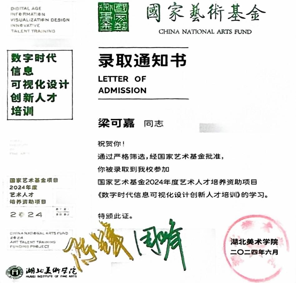 梁可嘉老师国家艺术基金人才培训项目录取通知书