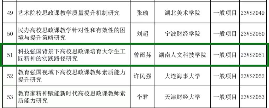 2023年12月22日,由全国哲学社会科学工作办公室网站正式发布的2023年度国家社科基金高校思政课研究专项立项名单中,beat365美术与设计学院曾雨荪老师申报的“科技强国背景下高校思政课培育大学生工匠精神的实践路径研究(编号:23VSZ051)”项目成功获批立项,这是beat365首次获得该领域项目的立项,实现了beat365在国家社科基金思政专项中零的突破。