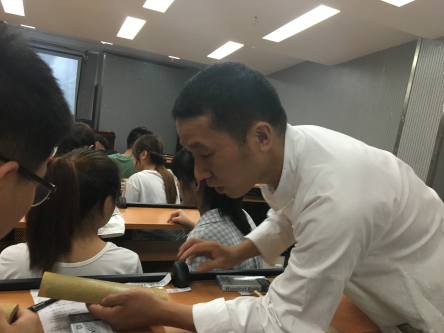 宁亮成老师从竹子的结构、生长习性以及竹子的各种种类进行一一讲解。他指出,当下最为流行的为留青竹刻,和我们书法专业的篆刻大同小异,有着异曲同工之妙,分为阴刻和阳刻,并且结合多媒体为学生进行了图文并茂的讲解。