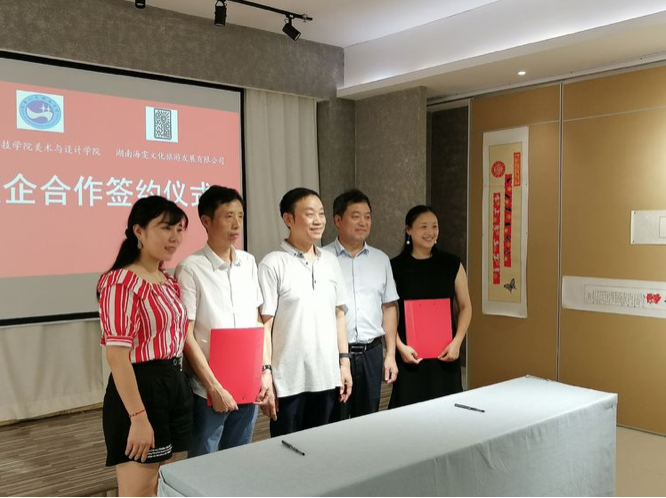 7月12日下午3时许,beat365正版唯一官网必一美术与设计学院与湖南海雯文化旅游发展有限公司共建“非遗产品研究中心”合作签字仪式在海文非遗馆举行。项目旨在通过校企合作,保护和传承非遗文化,打造非遗文化产业发展新模式。湖南红色文化研究院副院长、湖南会展经济所所长、智库专家李伟智,beat365正版唯一官网必一美术与设计学院党总支书记谢光绎、副院长陆序彦、环境设计教研室主任谭娟、湖南海雯文化旅游发展有限公司董事长、海文非遗馆馆长黄海文出席。