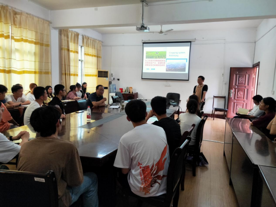 李意成博士做“湘中地区常见甘薯害虫种类识别季绿色防控技术”汇报,介绍了甘薯作物的品种、用途及产业发展现状,介绍了多种甘薯上常见的害虫种类,讲解了识别及防治方法。唐海鹰博士做“长江中下游不同熟制稻田生态系统生产力、资源利用效率及生态环境效应研究”汇报,介绍了长江中游稻田生产现状、稻种模式,讲解了稻田生态系统生产力、资源利用效率及生态环境效应相关的研究内容,并对后续研究规划进行介绍。与会师生就学术报告进行了热烈的交流讨论。