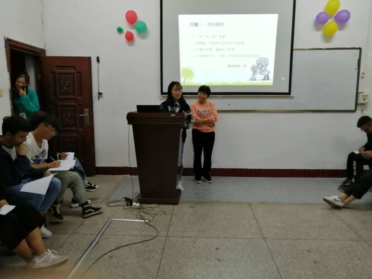 其次,介绍了心理委员工作原则:保密性原则、及时转介原则、实事求是原则、中立原则;四大工作技巧:学会倾听(正确的倾听姿势——“SOLER”)、无条件积极关注、积极共情、真诚陪伴,并介绍了农生院特色成长辅导室,过程中进行了一个游戏环节——你说我画。轻松的游戏过后聂恒老师强调了七个重点监控的时段(开学前后、放假前后、考试前后、重大活动前后、季节交替前后、新生入校后、毕业生离校前)和重点关注对象(情感危机、学习困难、经济困难、情绪困扰、行为异常)等注意事项,提出三种可能发生危机事件的警示讯号。