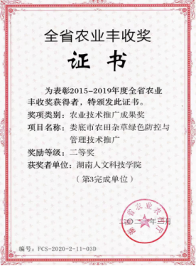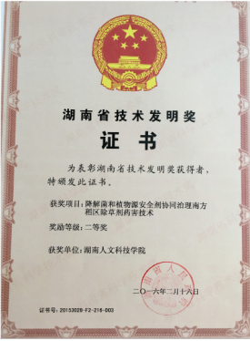 (5)湖南省农田杂草防控技术与应用协同创新中心,为我国农田杂草综合防控技术的可持续发展提供理论、技术、产品和人才支撑。经过5年建设,中心2019年通过上级验收合格,正式挂牌运行,为学科和专业发展提供人才与平台支撑。