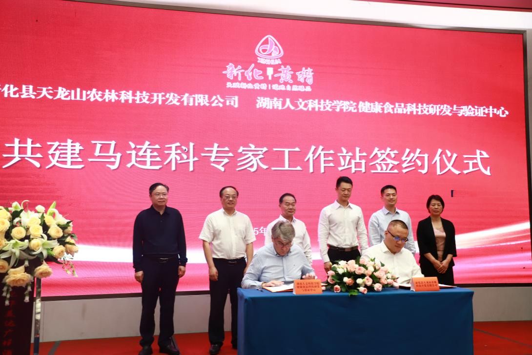4月22日,beat365正版唯一官网必一与新化县天龙山农林科技开发有限公司在新化县华美达酒店隆重举行专家工作站签约仪式。出席仪式的有校党委副书记朱强,农业与生物技术学院院长、娄底市农业科学研究所所长向国红,国际交流与合作处处长黄敏;娄底市科技局党组成员、副局长陈旭,新化县委副书记、人民政府县长彭韬等市县领导;以及娄底市委人才办、市科技局、新化县委县政府相关部门负责人和行业专家代表。