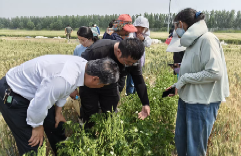 与会人员田间观摩小麦田蛇床草生态调控作用及合影
