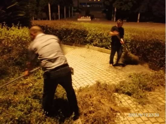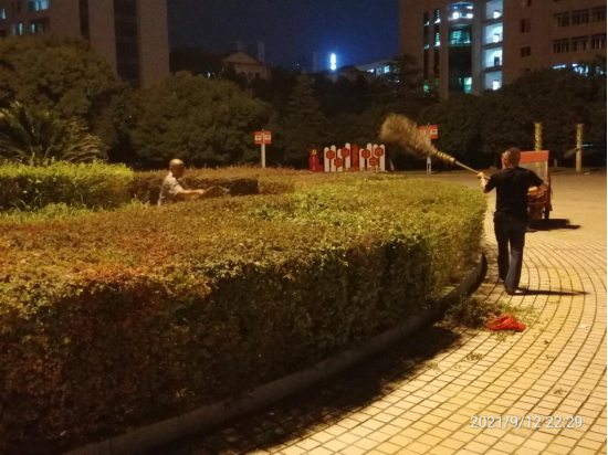 9时许,园林绿化实训中心主任彭日民带头冲锋在前,身先士卒,亲自动手修剪示范。科室全体工作人员扒、扫修剪下来的枝条,大家团结协作,争着干、抢着干,汗水渐渐浸湿衣背,定格成一幅晚上赶时间加班作业的动人画面。期间,海园灯柱定时晚上24点熄灯后,还呈现出打着手电筒照着作业的感人场景。由于时间长,不得不深夜呼叫学校水电中心临时送电,才得以继续作业,至9月13日凌晨1时30分左右才完成全部修剪清扫任务。