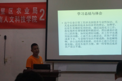 9月2日晚,农业与生物技术学院16级农学二班在强毅楼601教室举行了实习总结经验交流会,农生院教学副院长刘泽发、农学教研室主任杨泽良及院实习负责人赵佑柏参会。16级农学二班全体同学参加,在交流会上,各实习队代表向在场师生汇报了他们实习时的收获和感受。我院植物生产类专业实习工作按照教学大纲基本完成,实习单位类型主要为企事业单位及科研院所,同学们实习工作饱满。副院长刘泽发对同学们的实习汇报进行了总结发言,要求同学们完成实习总结,收心回到本学期课程学习及考研准备上来。赵佑柏老师对实习工作总结材料提出了具体要求,并对考研形势进行了分析。教研室主任杨泽良要求同学们珍惜时间,要同学们做好毕业选题及毕业准备。通过实习工作总结交流,同学们总结了实习学习情况,明确了大四的学习方向,实习总结交流会议取得良好效果。其他班级也以不同形式完成毕业实习总结工作。