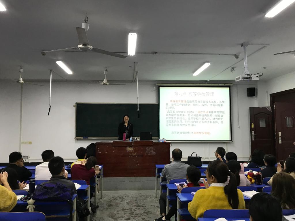 李香华一行到校后,直接进入培训教室听取了《高等教育学》课堂教学并对学员发表讲话。2019年全省高校教师岗前培训考试将于11月9-10日在湖南师大集中举行,李香华主任介绍了今年考试的新情况,特别强调了考试的严肃性与纪律要求,希望全体新学员要认真学习,以良好的成绩圆满完成岗前培训。