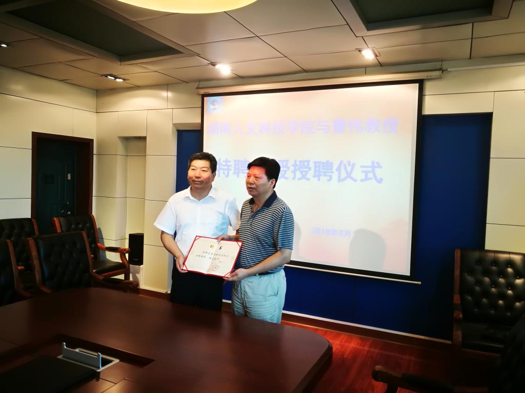 5月30日上午, beat365聘任广州大学曹伟为特聘教授授聘仪式在明德楼第一会议室举行,校长刘和云为曹伟教授颁发聘书。