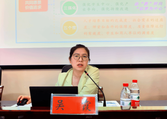吴霞教授分五个部分进行了详细阐述:新一轮审核评估简介、有关教育教学理念、审核评估与专业建设、审核评估与课程建设、对应用型课程开发的体会。报告中,吴霞教授特别强调了“五个坚持”的重要性,即:坚持以习近平新时代中国特色社会主义思想为指导;坚持落实教育“四个服务”和新时代本科教育要求;坚持破除“五唯”顽瘴痼疾;坚持以评促建、以评促改、以评促管、以评促强;坚持构建大学质量文化,引导高校建立健全质量保障体系。谈到专业建设和学科建设时,吴处长提出了具体的目标和实施路径,认为学校应重视人才培养目标的定位、定位合理性评价、目标达成度评价;重视师资队伍的建设,尤其是青年教师的培养;重视二级学院的教学管理规章制度建设等。要让每个专业的培养目标和毕业要求都由课程来支撑和实现。