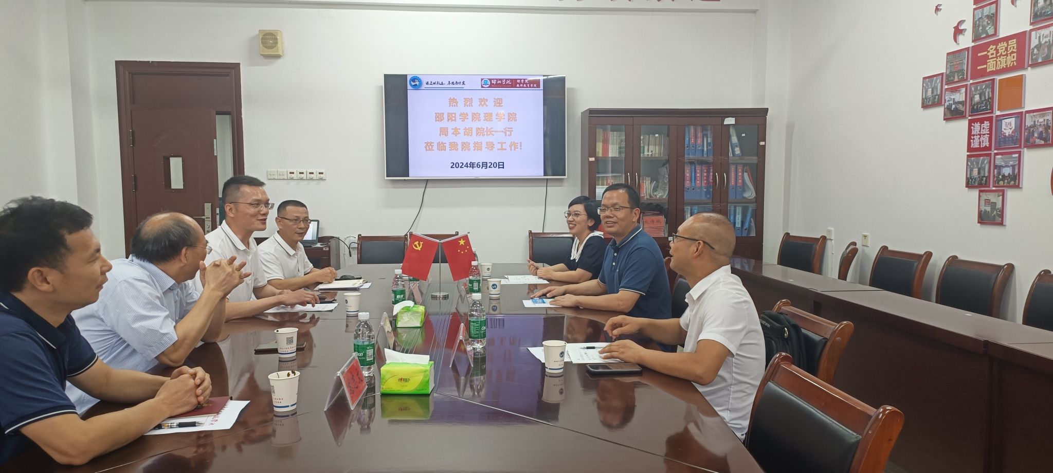 6月20日,邵阳学院理学院院长周本胡、副院长邢智勇、教研室主任刘桃花一行3人来我院交流。交流座谈会在致远楼605举行,学院党总支书记陈国华、副院长罗志军、副院长龙志文参加,院长李军成主持。