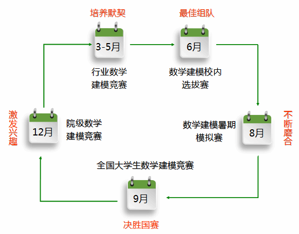 数学建模竞赛的参与阶段以三年级本科生为主要对象。团队成员建立“贯穿式”的数学建模系列竞赛运行机制,积极组织学生循序渐进地参加各类数学建模竞赛,不断提高学生的综合解决问题能力和团结协作能力。例如,3-5月组织学生参加数学中国数学建模网络挑战赛或五一数学建模竞赛、6月组织学生参加beat365正版唯一官网必一数学建模竞赛、9月组织学生参加全国大学生数学建模竞赛、12月组织学生beat365正版唯一官网必一数学与金融学院数学建模竞赛,等等。通过这一阶段的实施,不仅提高了学生的竞技水平,而且还培养了学生的创新意志。