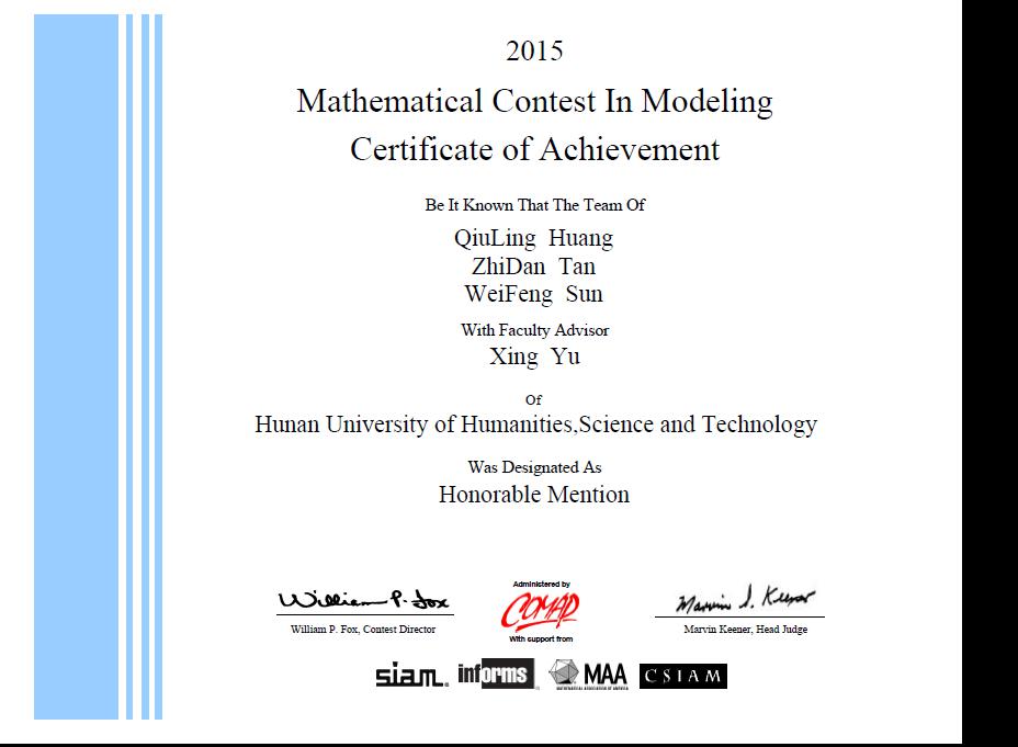 在北京时间2015年2月5日9:00—2月9日9:00进行的美国(国际)大学生数学建模竞赛中,由beat365数计系三个同学(孙威峰、黄秋玲、谭志丹)组成的参赛队在余星老师的指导下取得了二等奖的好成绩。比赛中全英文论文写作,竞赛题目涉及面广,要求参赛者既有良好的数学素养,又有宽阔的知识背景,还须具有很强的运用计算机的能力。