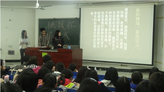 邀请了陈国华、谭本远、王立胜、李军成、罗志军等老师作为本次启动仪式的特邀嘉宾。王老师首先向我们介绍了“挑战杯”的竞赛方式竞赛内容和参赛资格。陈国华教授也对我们表示了厚望和鼓励。李军成老师也对此活动致辞。随后,参加过多次挑战杯的杨美娟学姐也说“只要你参加,就一定会有收获”,王老师也十分同意该观点。接着由学生自由提问,各位老师进行解答。