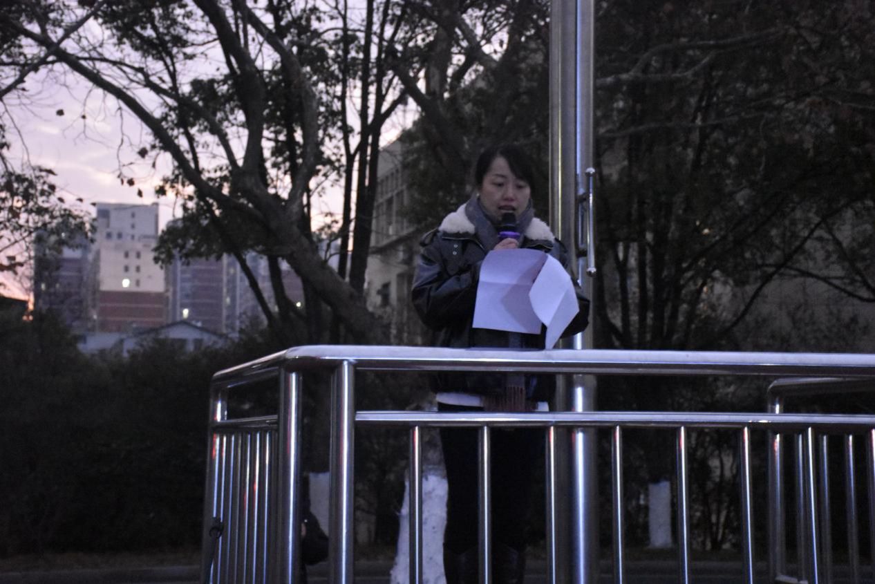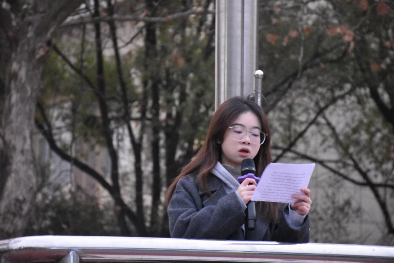 升旗结束后,2025级应数班学生代表李盼发言。她结合入学以来的感悟,抒发了新时代青年对国家的热爱与感恩之情,号召同学们珍惜青春韶华、刻苦钻研学问,将爱国情怀转化为强国之志与报国之行,努力成长为有理想、敢担当、能吃苦、肯奋斗的新时代青年。