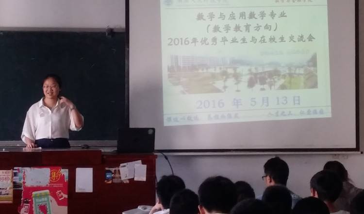 ,数学与金融学院数学教育方向2016年优秀毕业生与在校生交流会在致远楼412教室成功举行。本次交流会由数学与应用数学教研室负责具体组织,其目的在于通过优秀毕业生分享成功的经验,更好地促进在校学生合理规划各自的大学生活,并为本专业不同年级学生搭建相互交流学习的平台,起到帮助学生健康成长的同时促进专业建设良性发展的作用。
