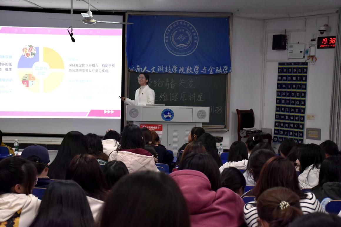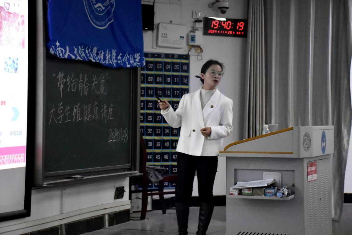 本次讲座邀请了娄底市妇幼保健院妇女保健科主治医师胡海姣前来宣讲。讲座围绕女性生理健康展开,先是通过图文介绍生殖系统结构与功能,让同学们了解自身身体结构。接着针对女生普遍关注的月经周期、量异常、痛经等问题给出科学解释和应对建议。在生殖健康与避孕知识部分,详细介绍多种避孕方法及其原理、有效性和适用场景,强调正确避孕的重要性。最后着重讲解性传播疾病预防,深入介绍艾滋病的传播途径、症状和危害。