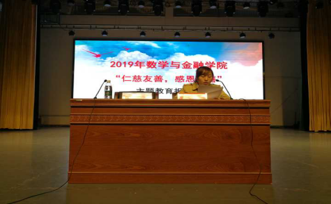 4月17日晚,数学与金融学院在逸夫楼举行了2019年学年“仁慈友善,感恩向善”主题教育报告会。学院党总支书记阳立新、副书记刘晔、全体辅导员、班主任及近600学生参加了报告会。会议由学院党总支副书记刘晔主持。