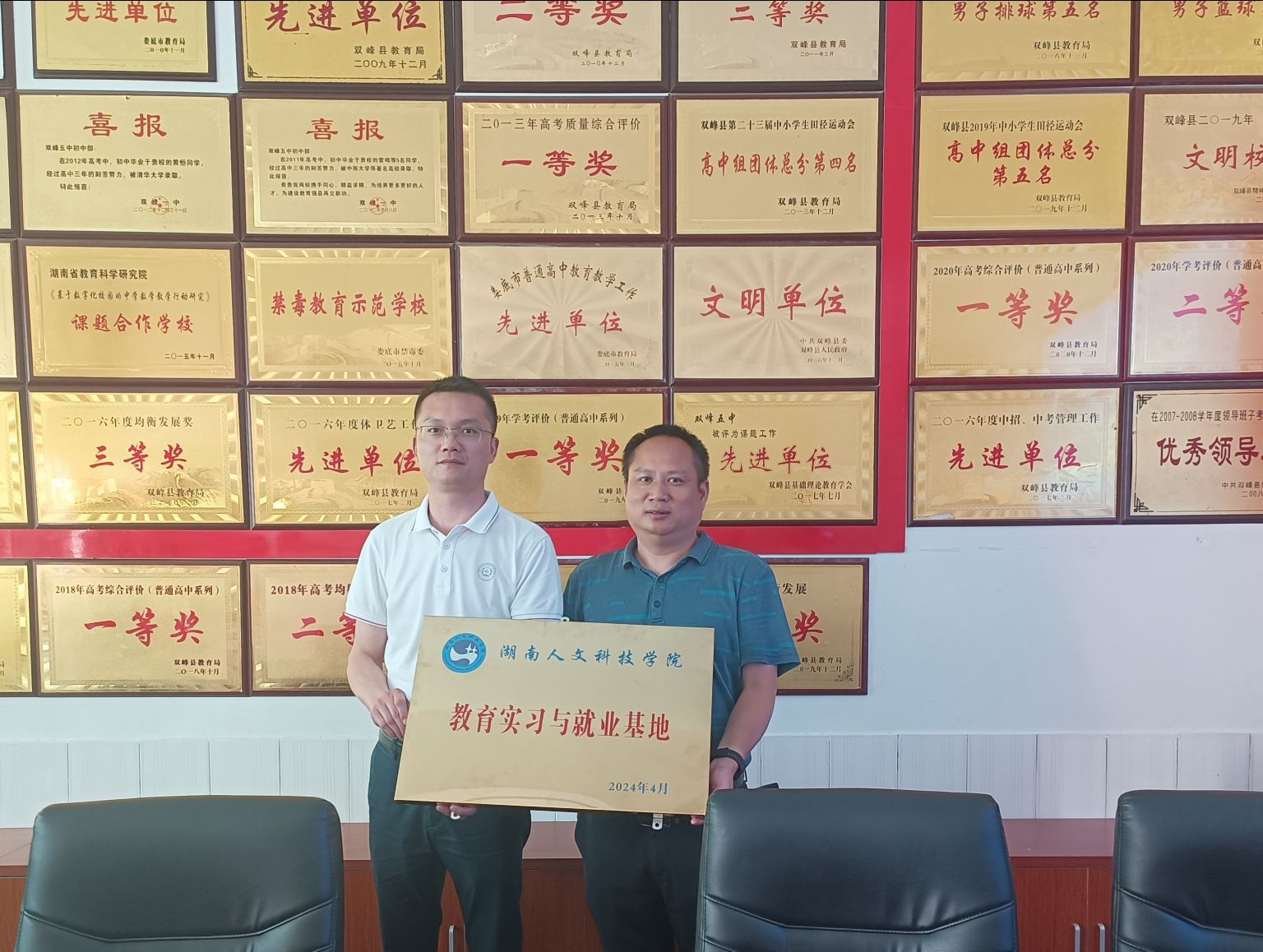 5月24日,学院与双峰县第五中学签订共建教育实习与就业基地协议暨授牌仪式在双峰县第五中学举行,院长李军成、副院长罗志军、教研室主任刘纯英以及双峰县第五中学校长赵红军和全体班子成员参加。