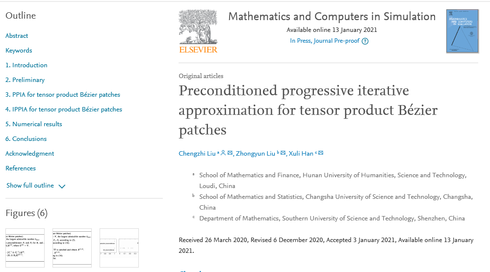 刘成志博士以第一作者在期刊《Mathematics and Computers in Simulation》(中科院SCI二区,IF: 2.90 )2021年第185卷上发表题为《Preconditioned progressiveiterative approximation for tensor product Bézier patches》的研究论文。该论文主要针对张量积型Bézier曲面的渐进迭代逼近法提出了一种预处理方法。所提出的预处理方法是基于前期成果中的对角补偿约化技术,利用了矩阵Kronecker积的性质,能更有效的发挥预处理子的作用。